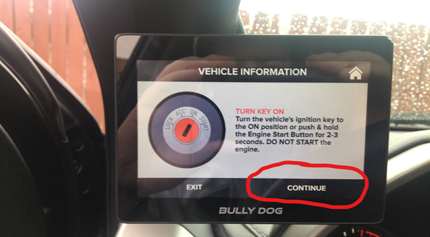 3. The next screen will tell you to turn the key to run WITHOUT starting the vehicle, once the key is in the run position you will select the continue option. (On push-button start vehicles, press the start button with your foot off the brake.)