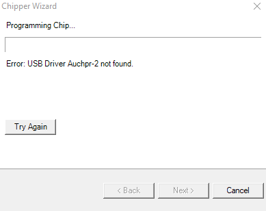 If the Eliminator Chip drivers are not installed on your computer, you’ll see the following error when attempting to program a chip: