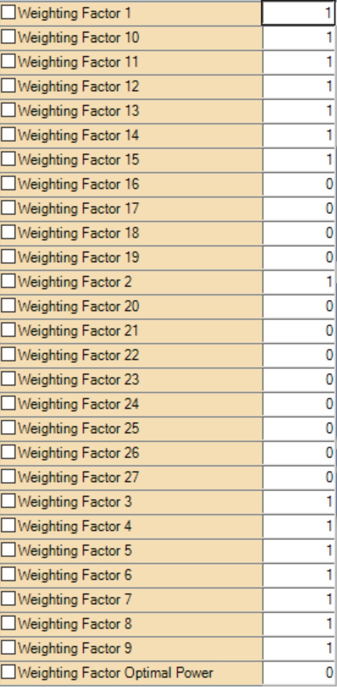 Set the weighting factor to be sampled. This will be located WEIGHTING FACTORS, INDIVIDUAL TABLES, SCALAR. Set all listed to 0 except single weighting factor to be sampled. (weighting factor count will vary depending on strategy)