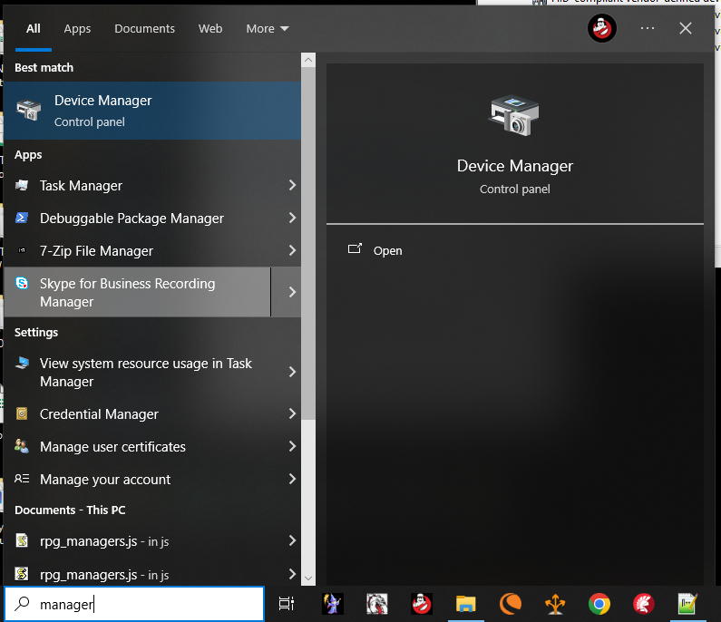Open Device Manager by typing "Manager" into the search bar at the bottom of your screen. Click on it in the list that appears. If you do not have this option you can also right click on the windows logo bottom left corner of your screen and select "Device Manager" from there.