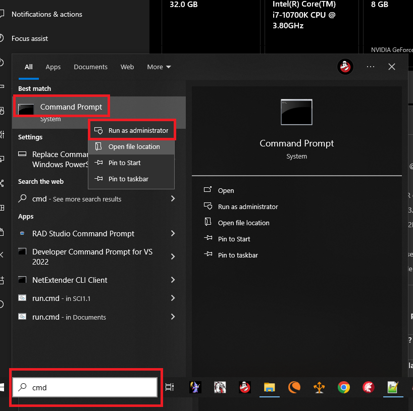 Open Command Prompt by typing "CMD" in the search bar Right-Click to run as Administrator. Then paste the appropriate command shown below.