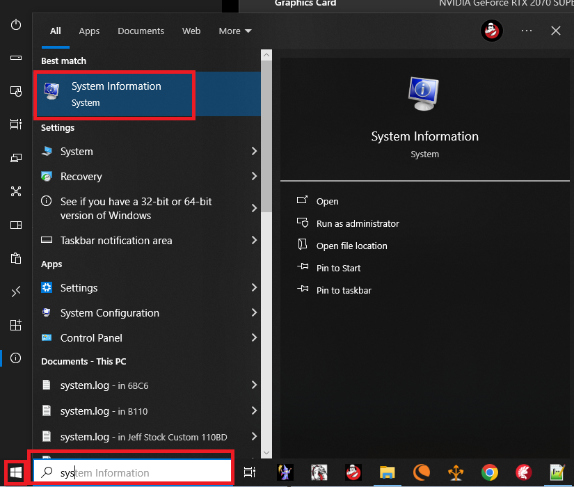 1. Type System Info in the Search bar at the bottom left corner of your windows and select "System Information" when it pops up. If you dont have a search bar you can also right click the windows logo in the bottom left corner of your screen and select "System Information" there.