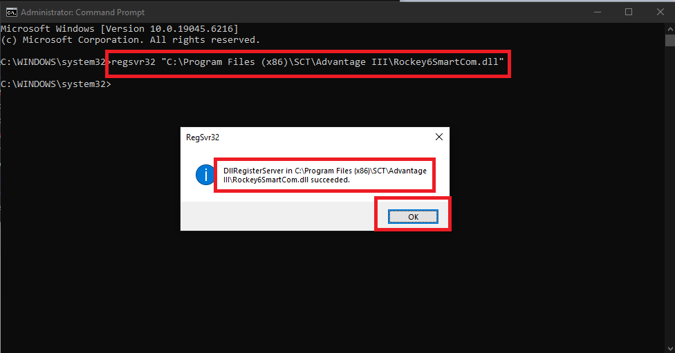 0405: regsvr32 “C:\Program Files (x86)\SCT\Advantage III\Rockey6SmartCom.dll” (99% of the time you will use this command) (Copy the Text in RED and double-check there are no extra spaces when you paste it into the CMD Prompt)