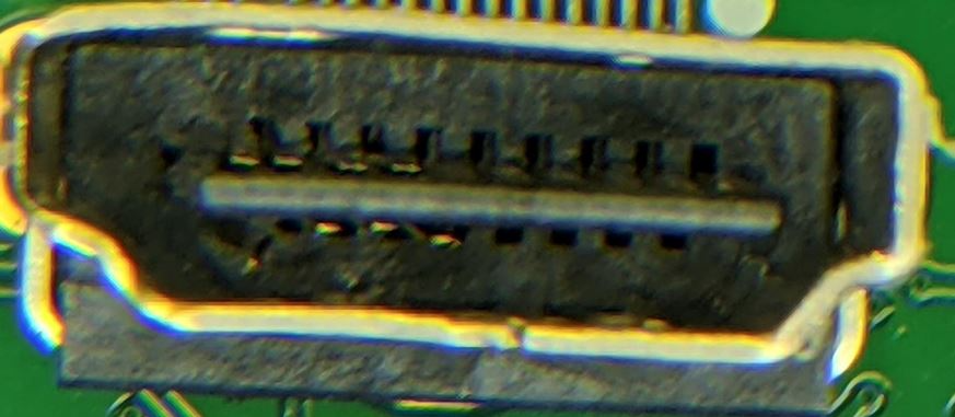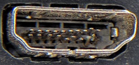 The next thing to check is the HDMI cable, port, and plug on the device. The pins on these are very small, and if misaligned and inserted with force, can be easily damaged. Below are some examples of HDMI ports with various issues such as broken pieces, bent pins, lifting pins.